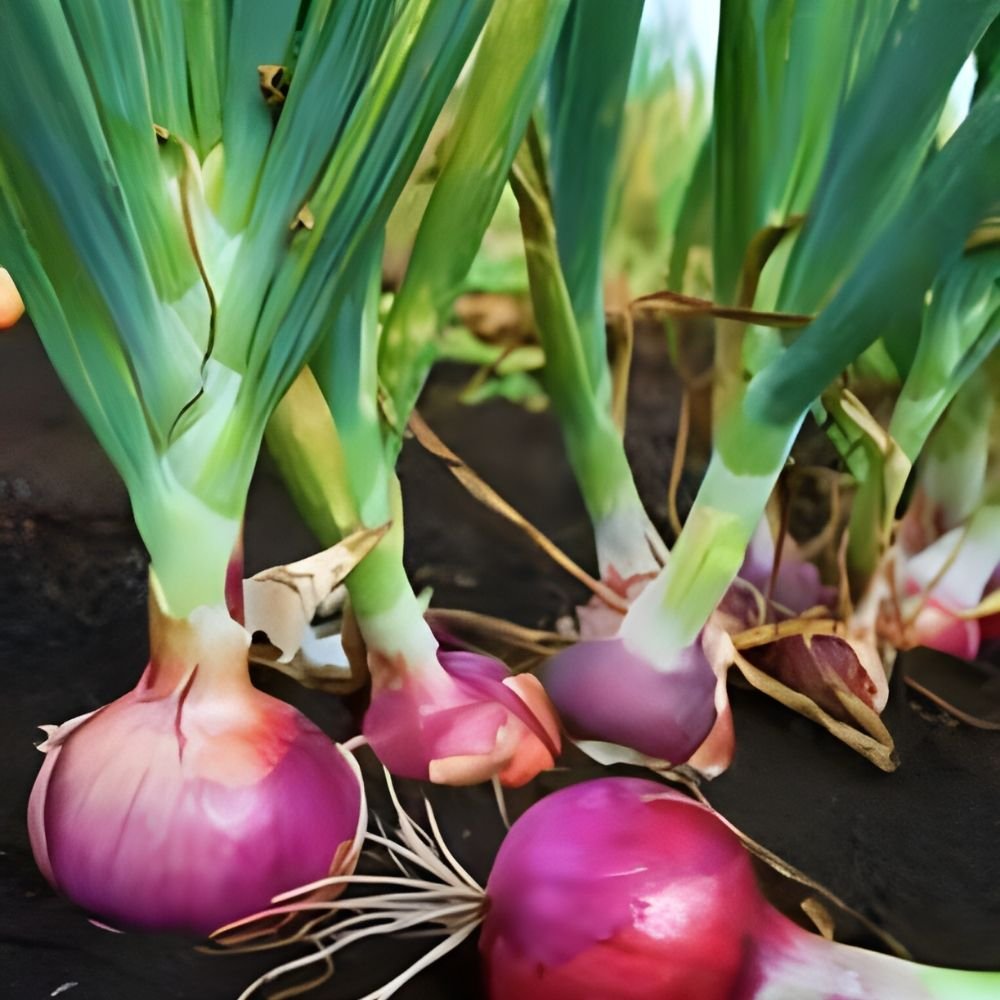 Ready for harvest in 4–5 months, red onions are resistant to pests and diseases with neem oil care.